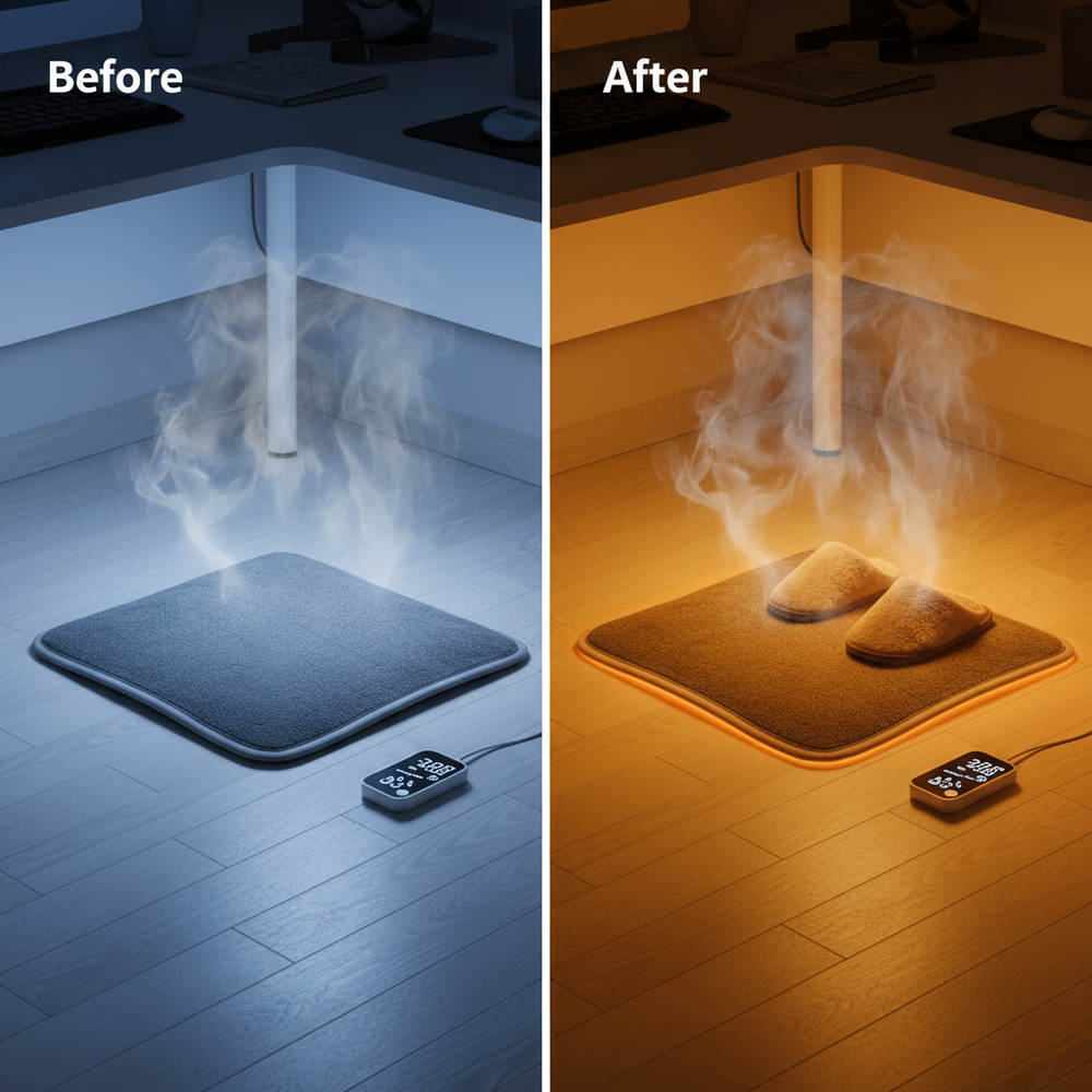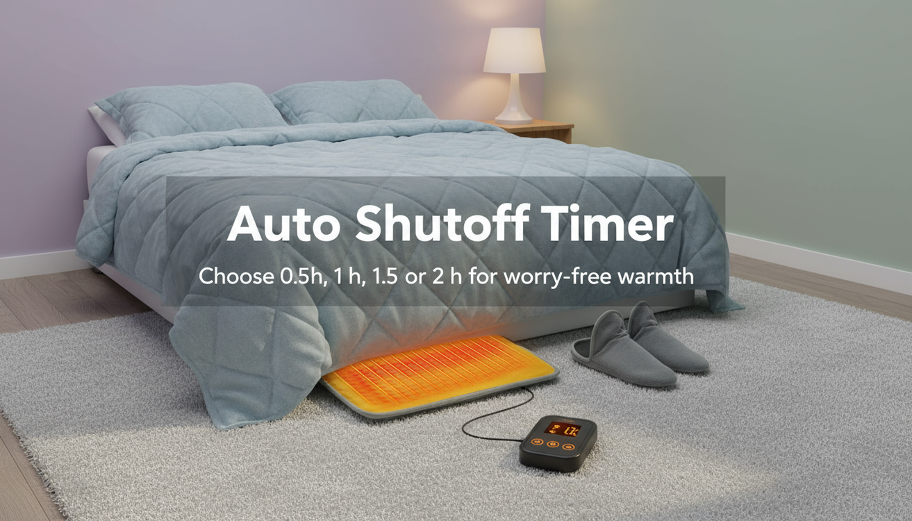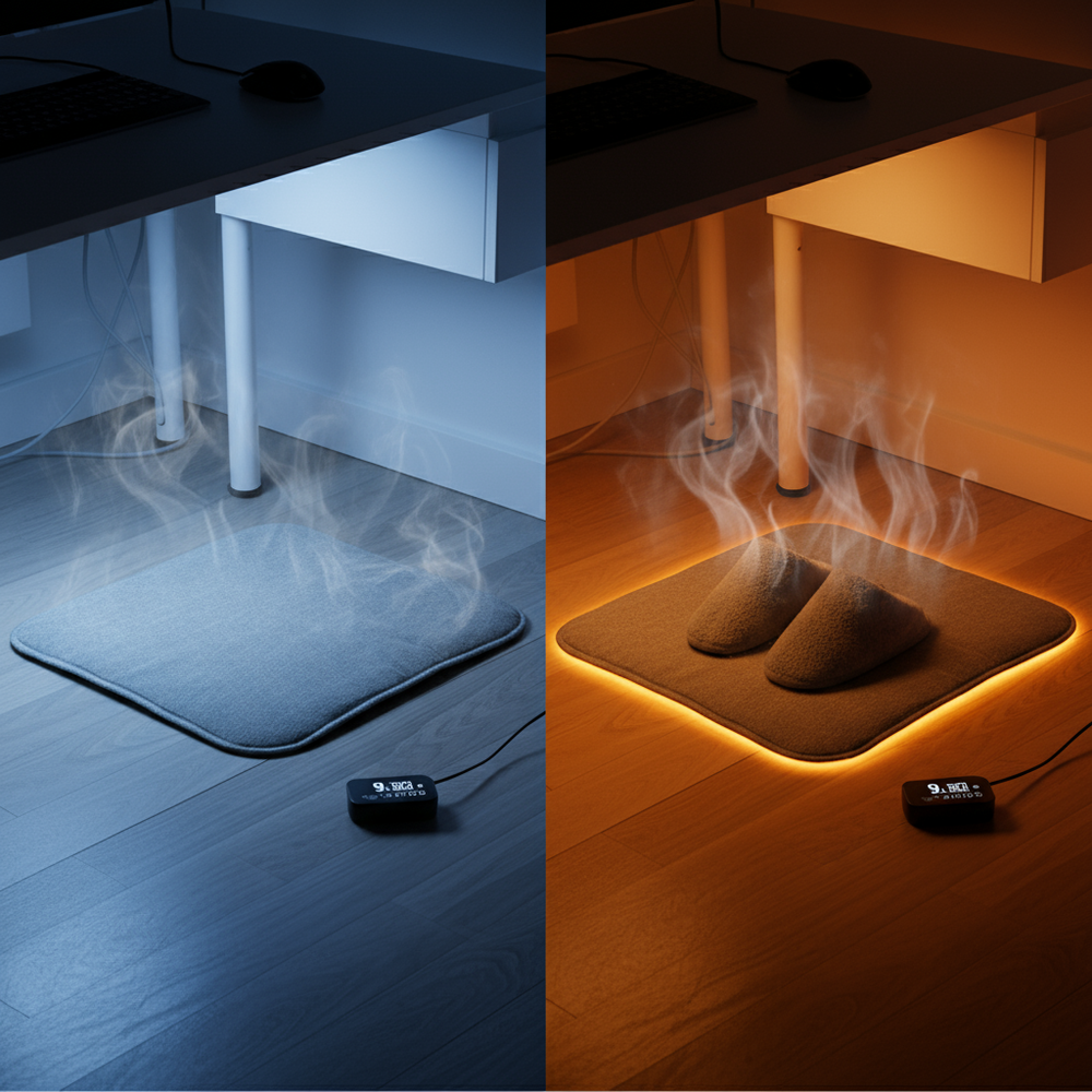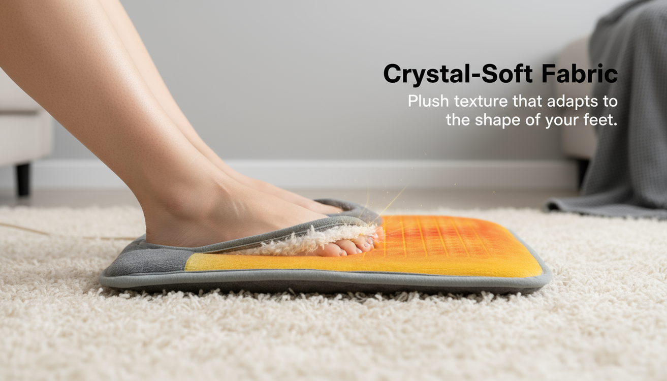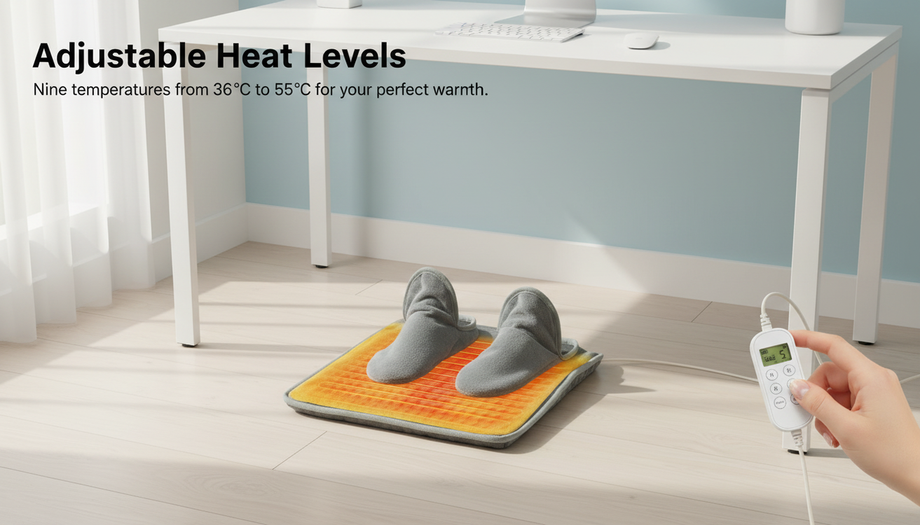 Discover the Ogavy Electric Heated Foot Warmer featuring nine adjustable heat levels from 36 °C to 55 °C, a plush crystal-soft fabric that molds to your feet, and a sleek 1.5 cm profile designed to fit seamlessly under furniture.